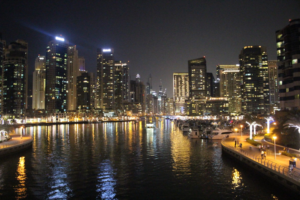 Camminando ancora sarei arrivato fino ad una spiaggia balneabile; oggi non ho fatto soste “ludiche” come ieri, per cui l’idea mi balena in testa. Poi però mi rendo conto della mia reale situazione fisica e decido di soprassedere mettendomi ad aspettare il pullman. Noto con estremo piacere che il C10 mi avrebbe portato direttamente alla metro di Burjuman, cioè il punto di cambio tra metro rossa e metro verde (la “mia”). Come da programma trovo un sedile vuoto e lo occupo coattivamente per l’intero tragitto. Arrivo così in camera e ripeto esattamente le operazioni di rito della sera precedente: doccia, lavaggio accurato delle scarpe e cambio con abiti puliti e degni dell’occasione. Esco di nuovo dall’albergo e torno sulla metropolitana per un altro lunghissimo viaggio fatto al 95% del tempo di percorrenza in piedi. Inutile pregare (se ci credessi…ovviamente) perchè tanto non c’è trippa per gatti; quando la sfortuna ci si mette di storto non si può fare nulla. Scendo alla fermata “Jumeirah Lake Towers”, mia vecchia conoscenza, e percorro la strada che mi porterà di lì a poco sul lungomare della Marina. Ma, una volta arrivato sul ponte principale vengo bloccato dalla vista pazzesca che ho davanti: